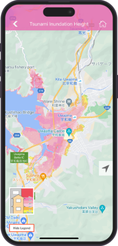 "Tsunami Inundation Depth", "Flood Inundation Area Planned Rainfall", "Flood Inundation Area Assumed Maximum Scale Rainfall", "Landslide Hazard Area", and "Landslide Hazard Warning Area/Special Warning Area" are divided into maps of areas that are expected to be affected by disasters such as typhoons, heavy rain and tsunami. The map can be zoomed in and out, allowing you to smoothly obtain information on your current location.