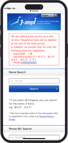 In addition to the safety information on the Disaster Message Boards provided by telecommunications carriers, the site will connect to the "J-anpi Safety Information Collective Search" site, a joint site where safety information collected by various companies and organizations can also be checked together.