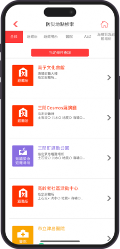 宇和島市內的防災據點,可透過選單選取「避難所」、「避難場所」、「醫院」、「AED」、「海嘯緊急避難場所」、「海嘯避難大樓」,選取後,在地圖上便能顯示據點位置。